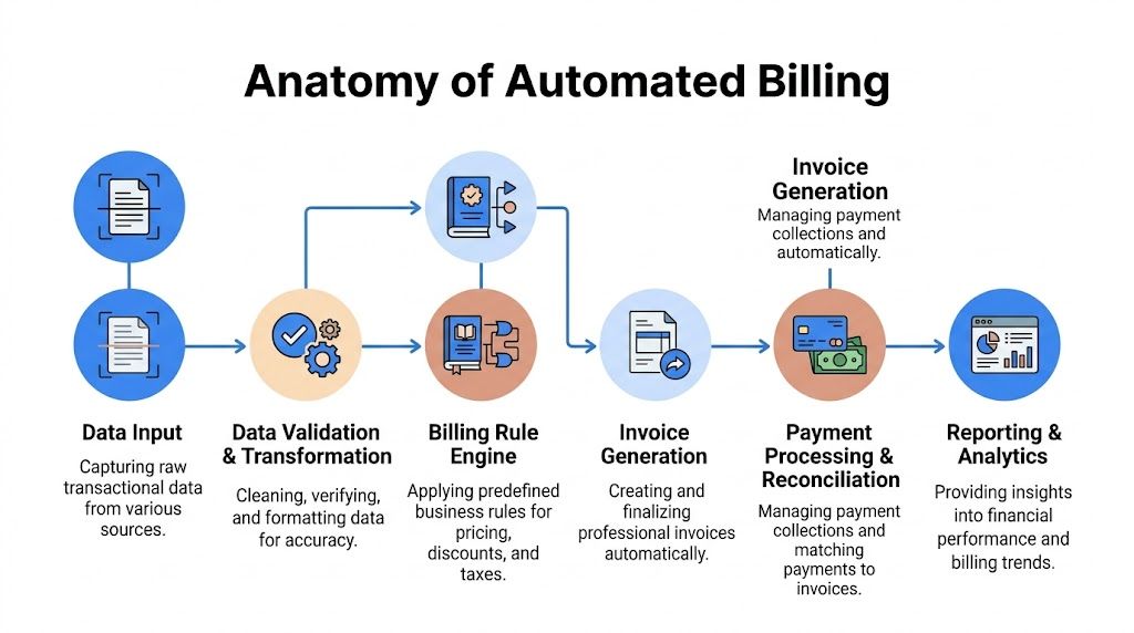 A real automated billing system doesn’t just send invoices faster. It creates a repeatable flow from input to invoice to payment. That matters because month-end problems usually start upstream, long before a PDF invoice is created.