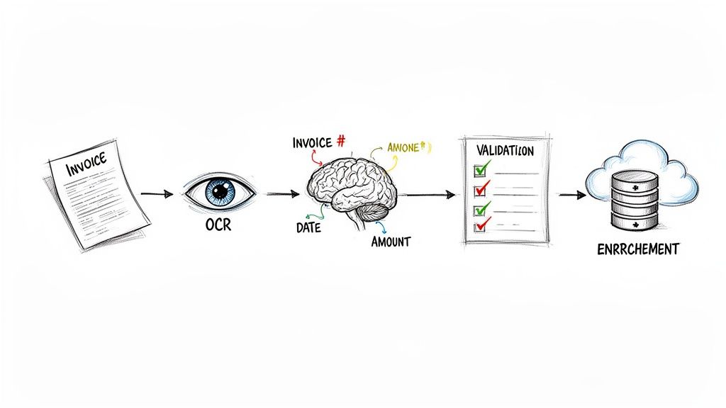 - Extraction & Understanding: This is where the magic happens. Using AI-powered technologies, the software doesn’t just read the text; it understands it. It knows an “invoice number” is different from a “PO number” and can spot the “grand total” even if it's in a different place on every document.