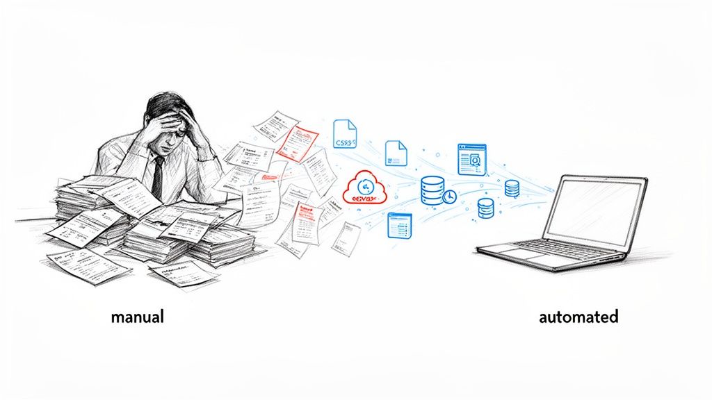 Automated data entry is all about using smart tech, like AI and optical character recognition (OCR), to pull information from your documents and get it into your business systems—no hands required. It’s the answer to getting rid of tedious, error-filled manual typing from invoices, reports, and forms. For any business feeling buried in paperwork, this is how you turn a daily drag into a real advantage.