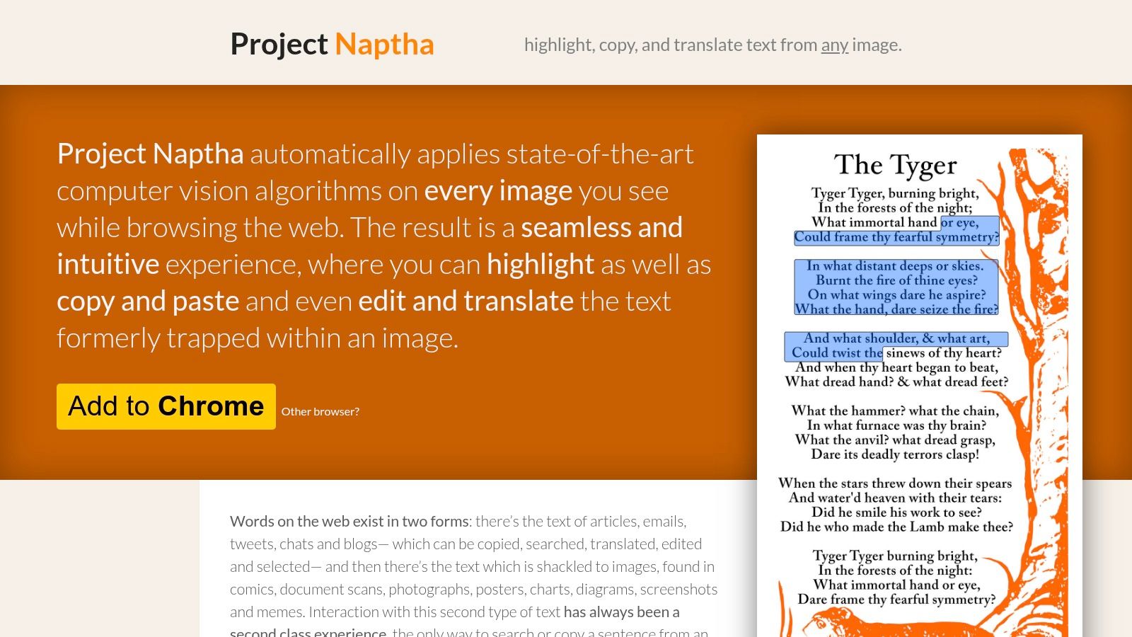 Project Naptha offers a unique approach to OCR by integrating directly into your Chrome browser. Instead of being a standalone application or web uploader, it's an extension that allows you to select, copy, and translate text from any image you encounter on the web. This makes it an incredibly useful tool for researchers, students, or anyone who needs to quickly grab text from a diagram, infographic, or screenshot without downloading the image first.