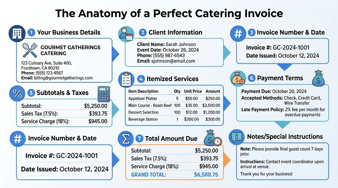 Before you build the document, get the structure right. A catering invoice isn’t just a payment request. It’s the written record of what you agreed to provide, what changed, and what the client owes now.
