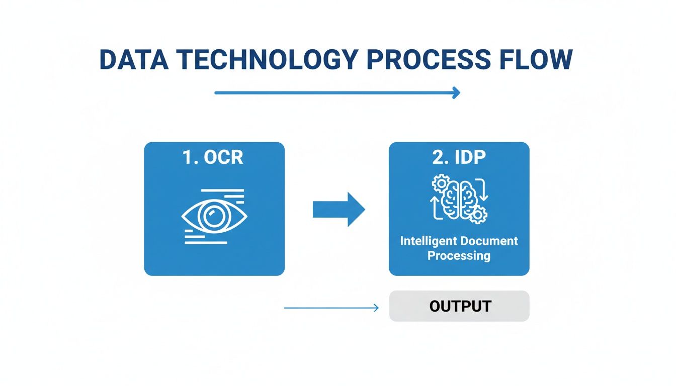 This visual makes it clear: OCR acts as the "eyes" to read the words, while IDP is the "brain" that interprets their meaning and context. That's the secret sauce.