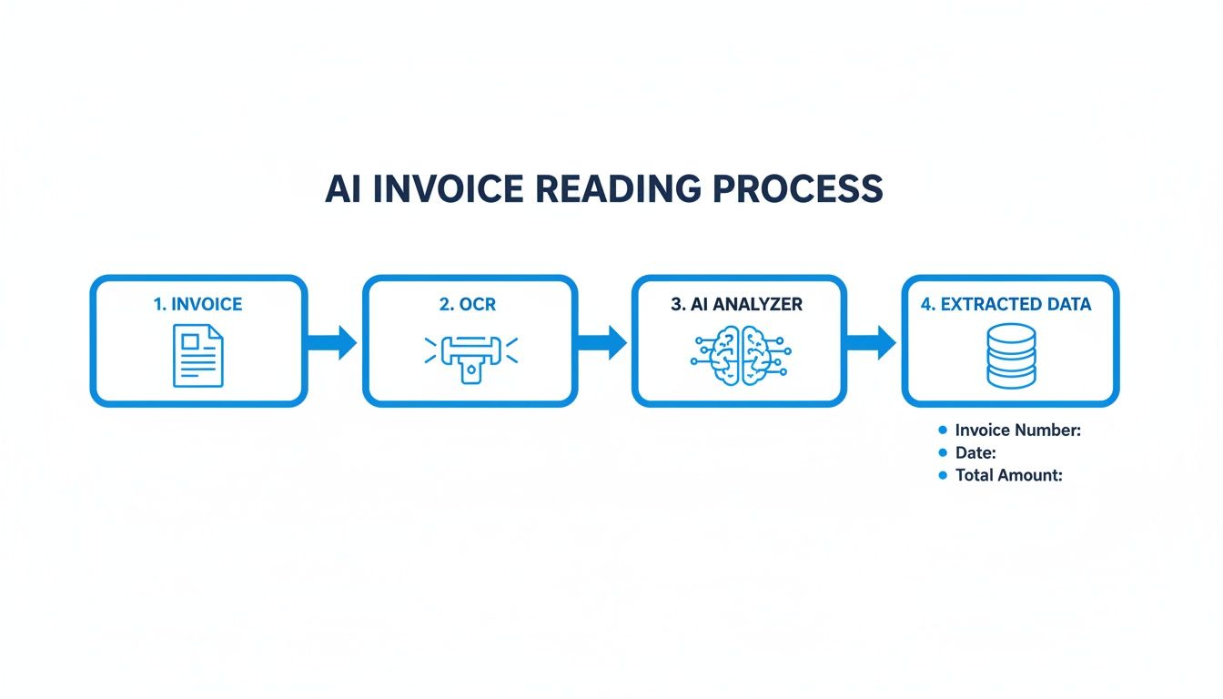 First up, the document gets fed into an OCR engine. This could be anything from a crisp PDF emailed from a supplier to a slightly crumpled scan of a paper invoice. The OCR's job is straightforward but absolutely vital: it scans the image and turns every letter and number it finds into digital, machine-readable text. It essentially transforms a picture of words into actual text data. If you want a deeper dive into the mechanics, you can learn more about what Optical Character Recognition is and how it works.