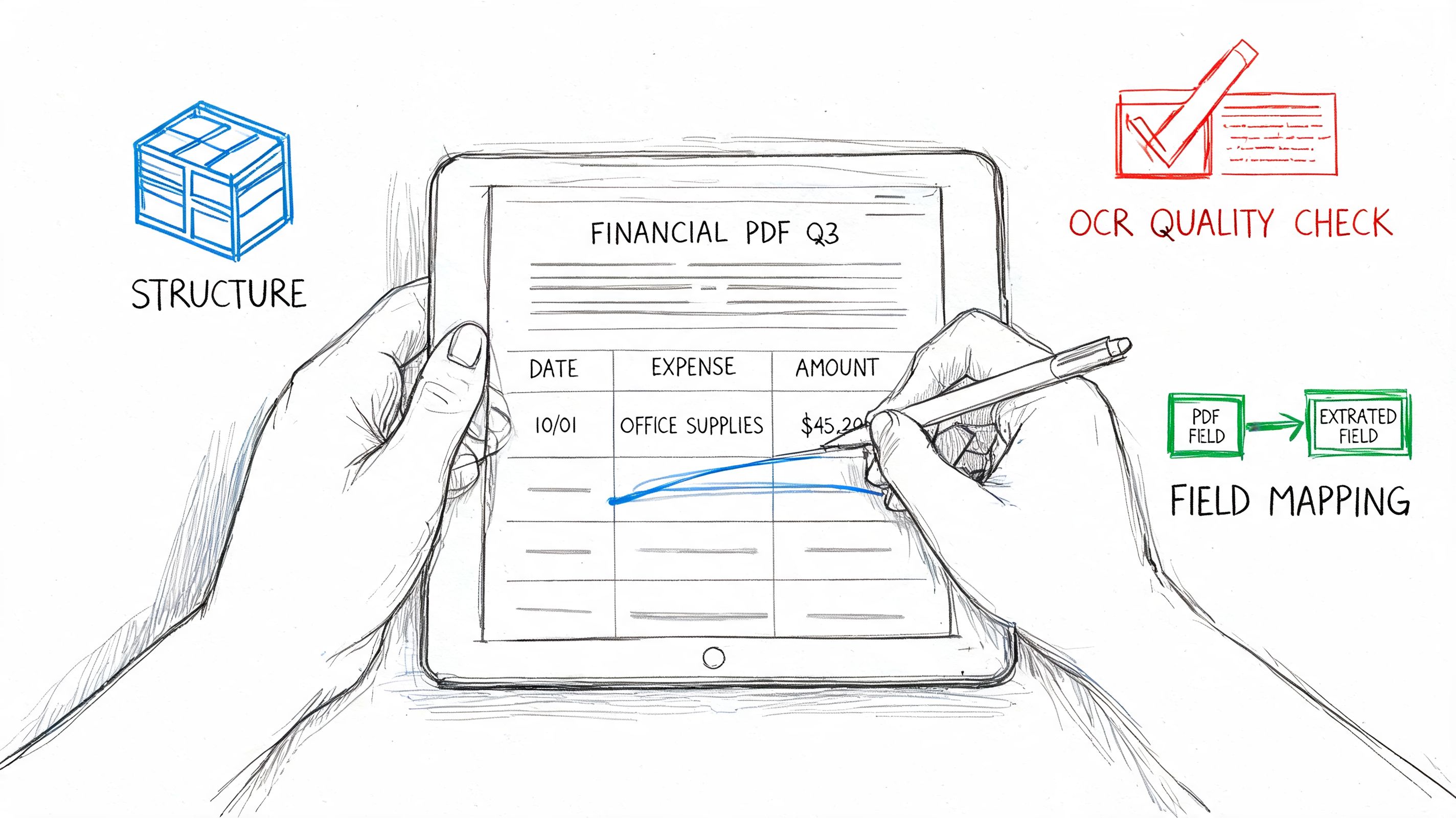 Even good AI extraction has weak spots. Low-quality scans remain a problem. Dense tables with merged cells still create ambiguity. Multilingual layouts, handwritten notes, and footnotes can all reduce reliability.