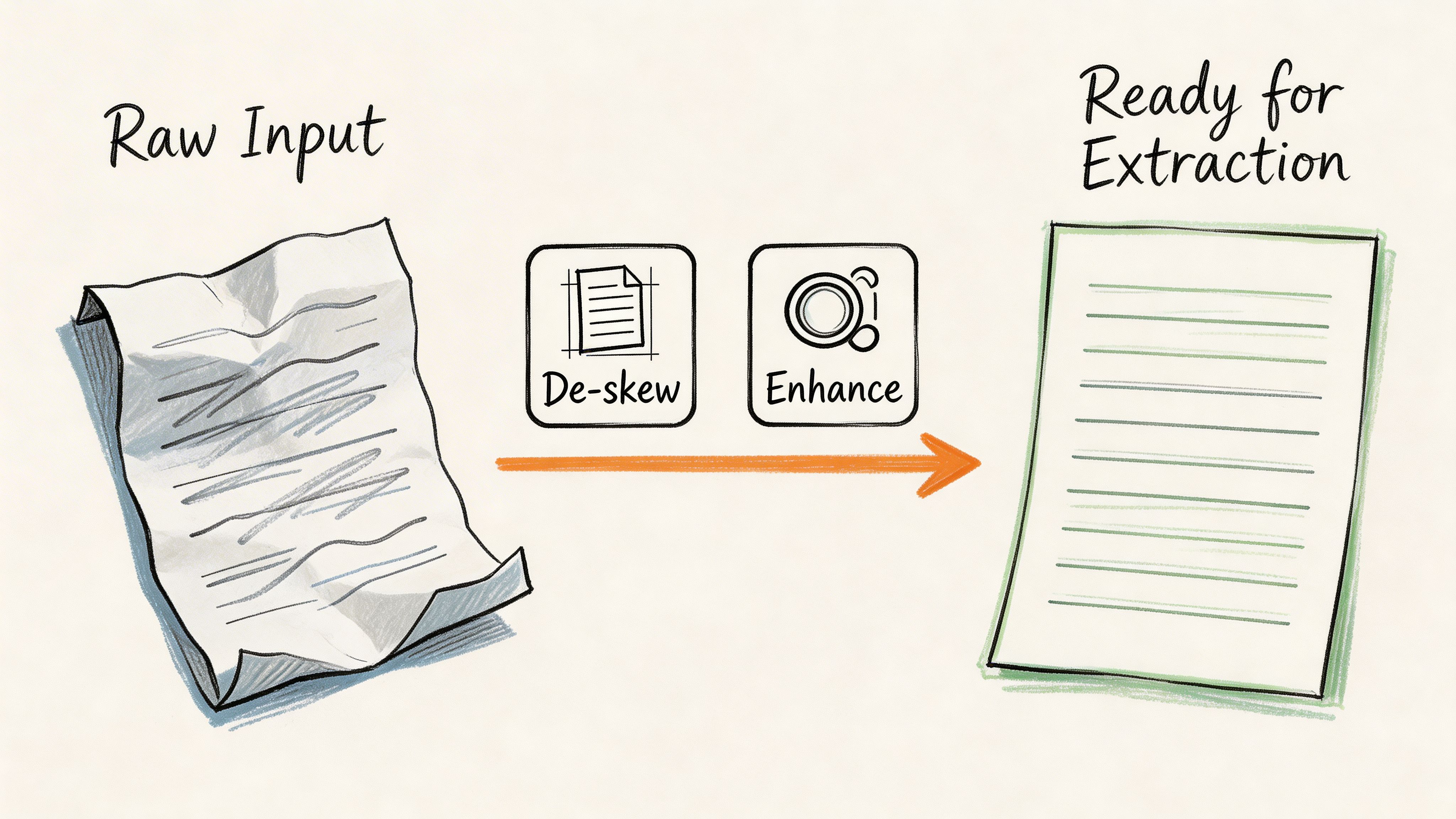 A practical preprocessing workflow usually starts with deskewing, noise reduction, and contrast normalization.
