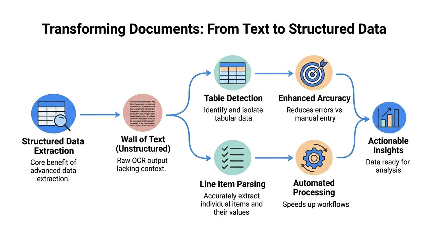 Basic OCR answers one question: what characters appear on this page? Structured parsing answers a different one: what does each piece of text mean, and how does it relate to nearby values?