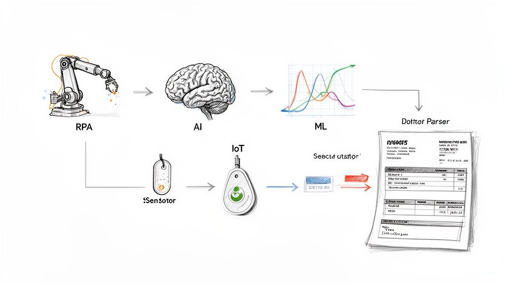 To really get what supply chain automation is all about, you have to look under the hood at the engines driving it. These aren't just buzzwords; they're practical tools built to handle specific jobs with incredible speed and accuracy. When they work together, they create a powerful system that completely changes how a business operates, shifting it from manual grunt work to intelligent, automated execution.