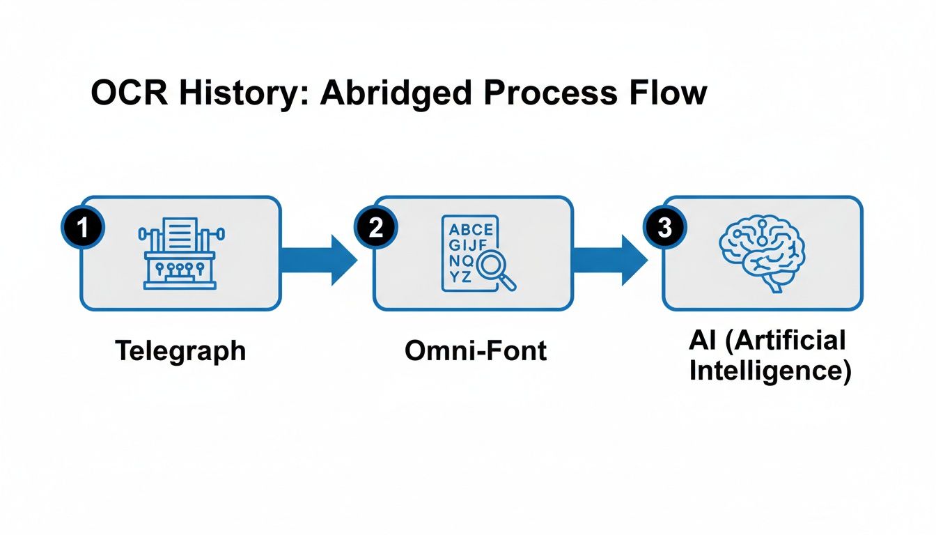 The technology has come a long way. This visual shows the key moments in OCR's history, from its early telegraph-inspired roots to the sophisticated AI we use today.