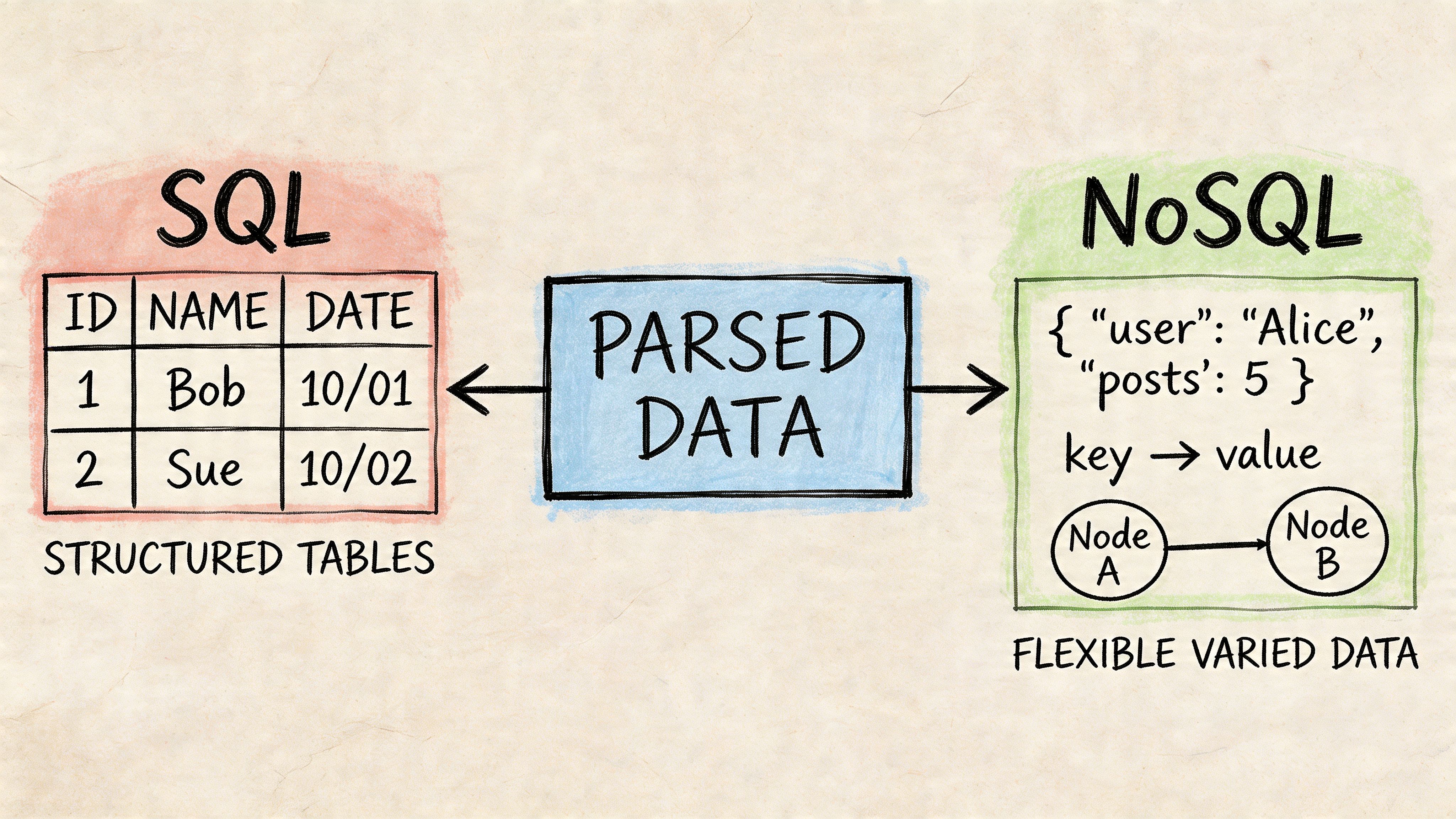 Once the parsed data is clean, you still need to decide where it should live. Typically, the practical choice is between SQL databases and NoSQL databases.