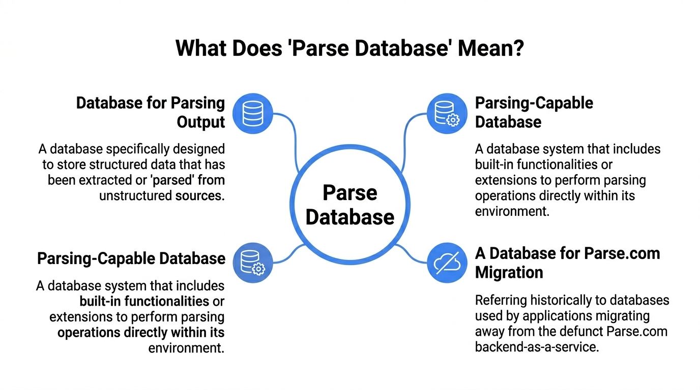 A manager might ask for a “parse database” and get two very different answers from two different teams. An app developer may hear “Parse,” the backend platform. An operations lead may mean a database that stores fields pulled from invoices, contracts, claims, or forms.