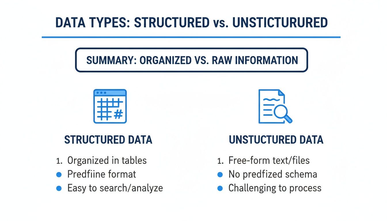 customer_name,order_date, oramount. This strictness ensures consistency, but it also means the system is inflexible. - Unstructured Data, on the other hand, has no predefined schema. An email, a PDF contract, a customer support chat log, or a product photo exists in its native format. This flexibility is great for capturing all kinds of information, but it makes automated processing a much bigger challenge.